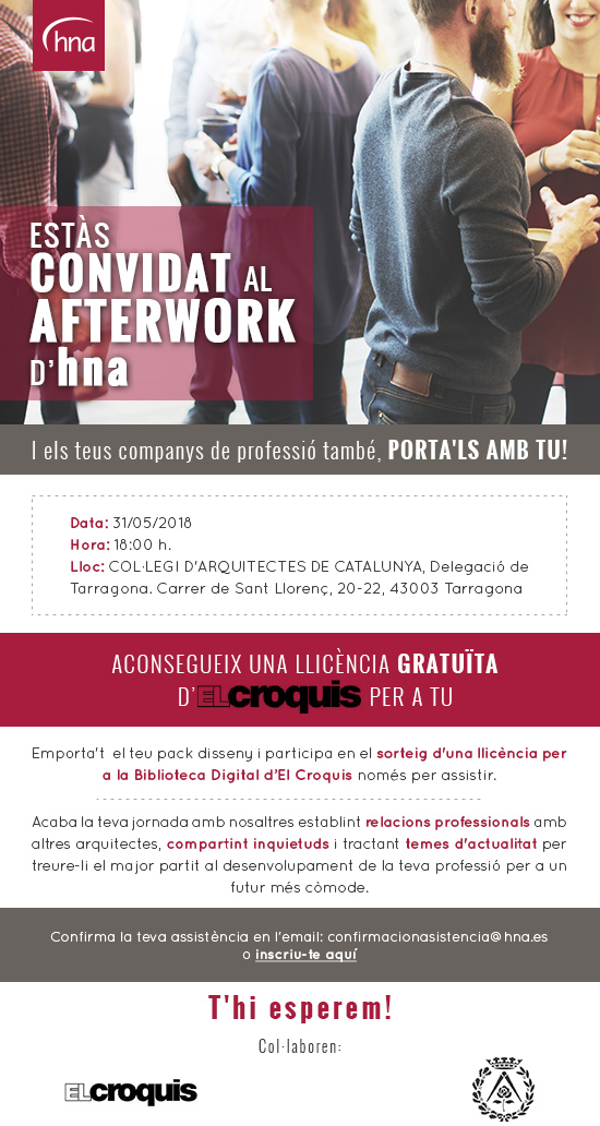 Demarcació de Tarragona del COAC. Un acte organitzat per HNA on es donaran a conèixer les diferents possibilitats que ofereix la mútua. Tota la informació aquí. Cal fer la inscripció prèvia en aquest enllaç.