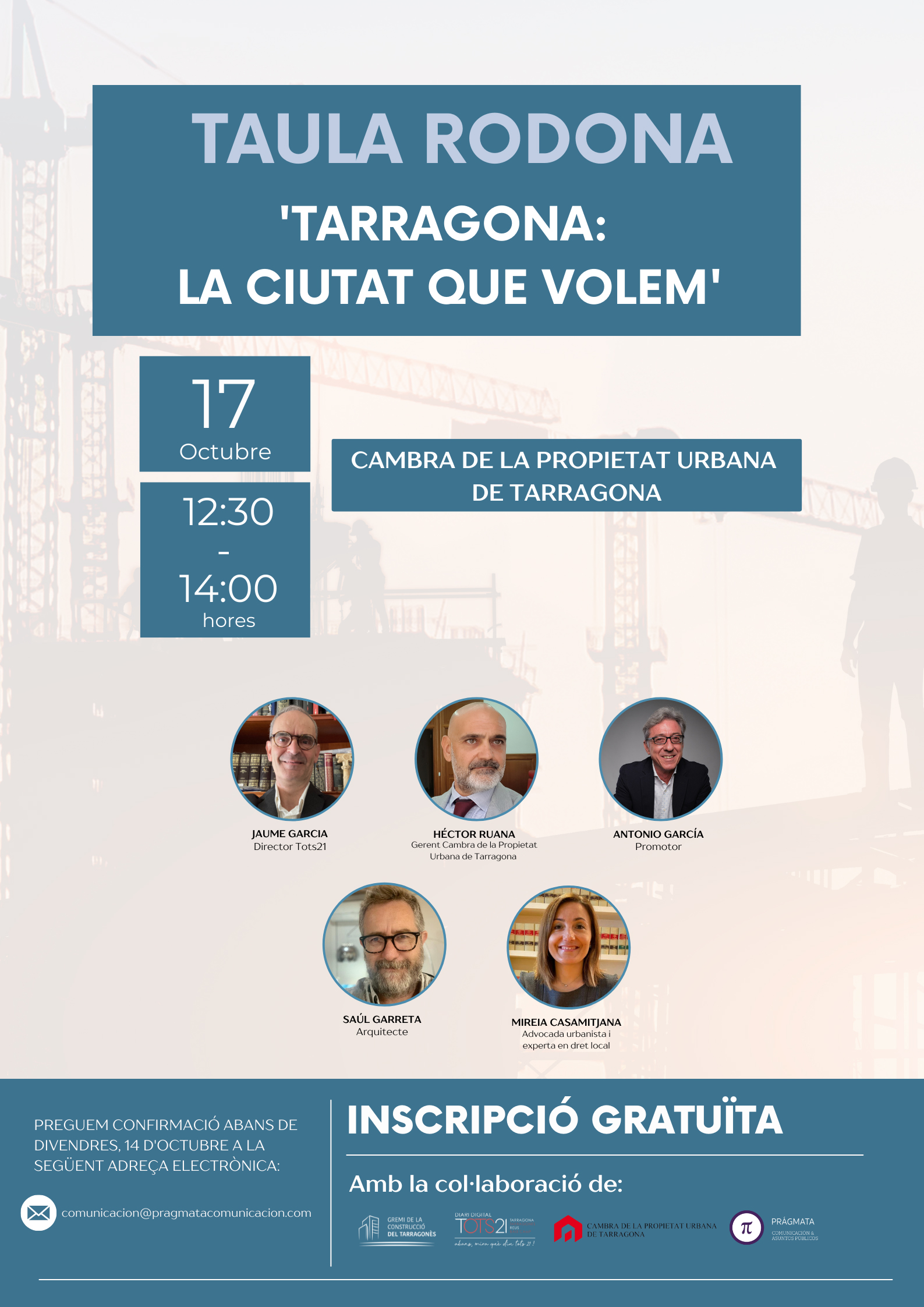 El dilluns 17 d'octubre, de 12:30 a 14 h, tindrà lloc una taula rodona organitzada pel Gremi de la Construcció del Tarragonès sota el nom “Tarragona: la ciutat que volem”. <+info> |