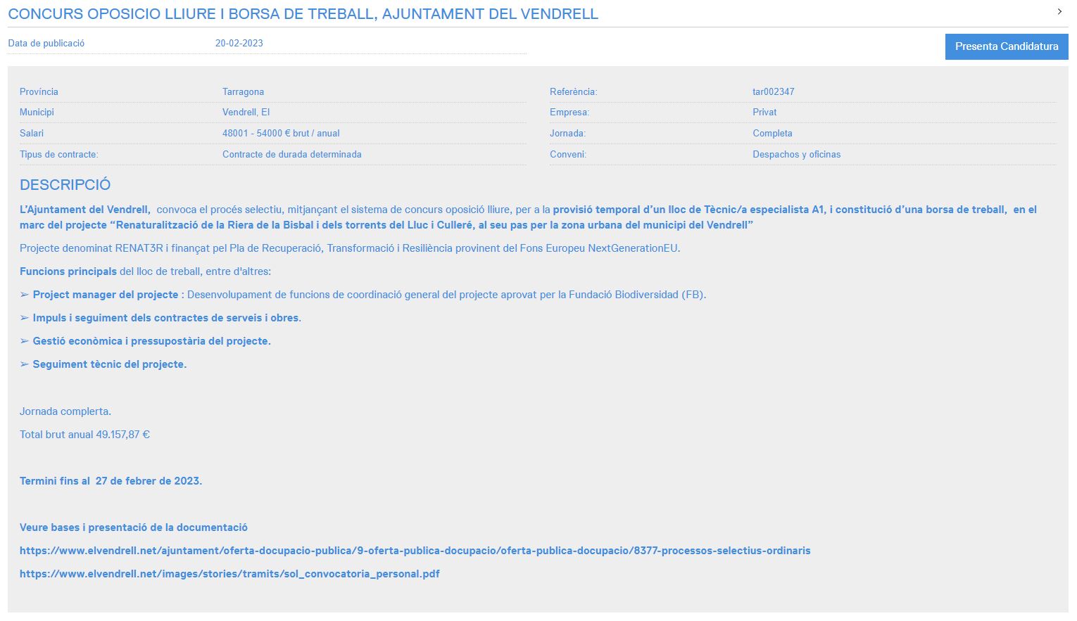 L’Ajuntament del Vendrell, convoca un procés selectiu per oposició lliure, per a la provisió temporal d’un lloc de Tècnic/a especialista A1. Fins al 27 de febrer de 2023.