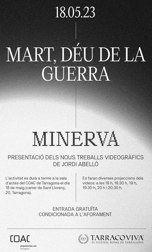 Presentació dels nous treballs videogràfics de Jordi Abelló, amb motiu del XXV Festival Romà de Tarragona, Tarraco Viva. Es faran diverses projeccions dels vídeos, a les 18 h, 18:30 h, 19 h, 19:30h, 20 h i 20:30 h. L'entrada és gratuïta, però està condicionada a l'aforament.