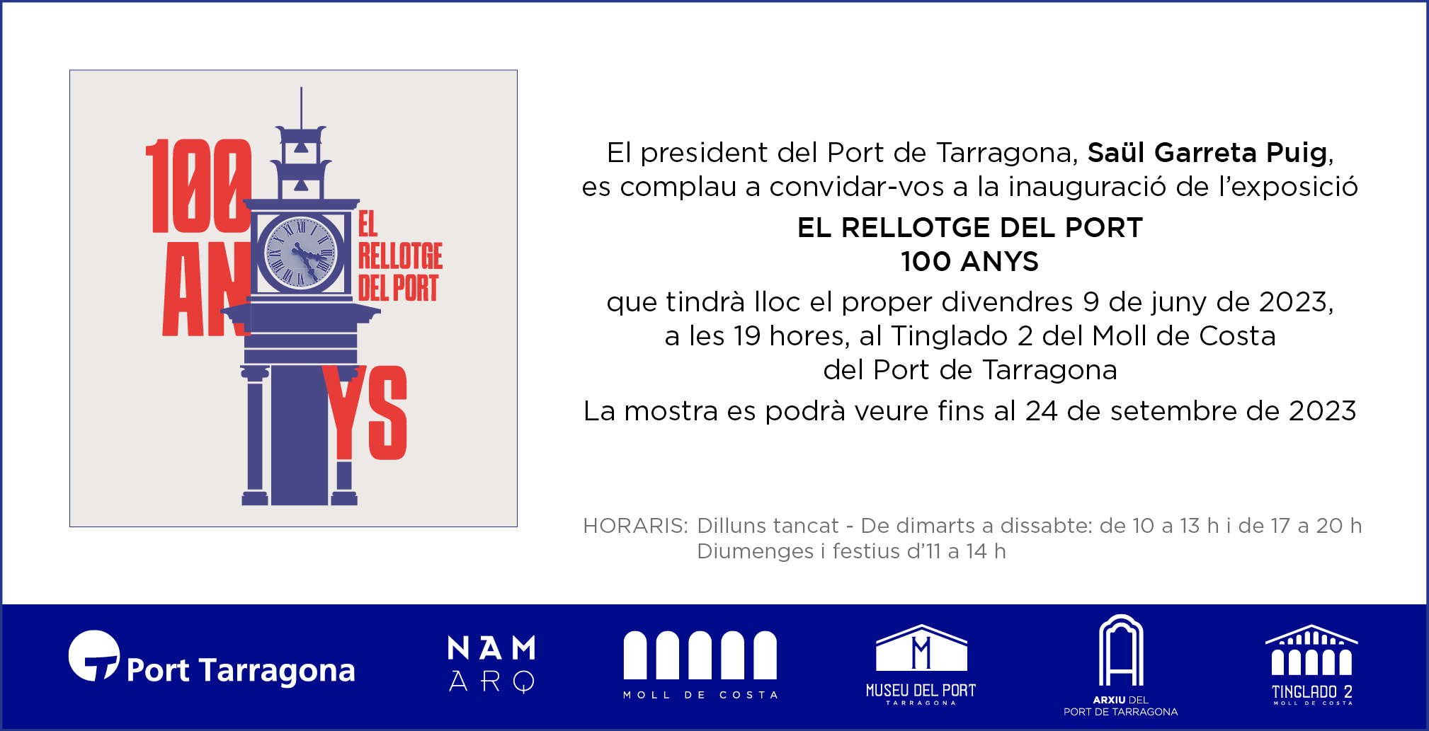 Exposició "El Rellotge del Port, 100 anys", es podrà veure fins al 24 de setembre de 2023, al Tinglado 2, dilluns tancat, de dimarts a dissabte de 10 a 13 h i de 17 a 20 h, i diumenges i festius de 11 a 14 h.