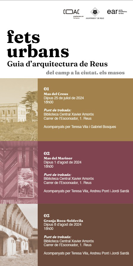 | El COAC Tarragona, l'Ajuntament de Reus i l'EAR organitzen tres visites per la Guia d'arquitectura de Reus - fets urbans. Per a més informació accedeix al cartell. >> |