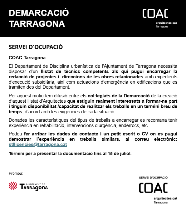 El Departament de Disciplina urbanística de l’Ajuntament de Tarragona necessita disposar d’un llistat de tècnics competents. Fins al 15 de juliol. >> |